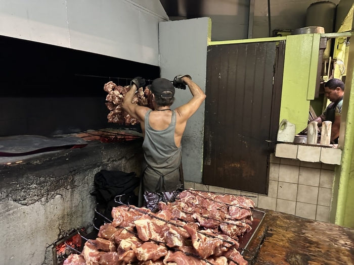 푸아 로티를 만드는 상인 /사진= 강예신 여행+ 기자 수산물이 위주인 시장이지만 육류를 판매하는 곳도 조금 찾아볼 수 있다. 특히 푸아 로티(Pua Roti)라는 돼지고기 구이 요리는 시장 입구부터 길게 줄이 서 있을 정도로 인기다.