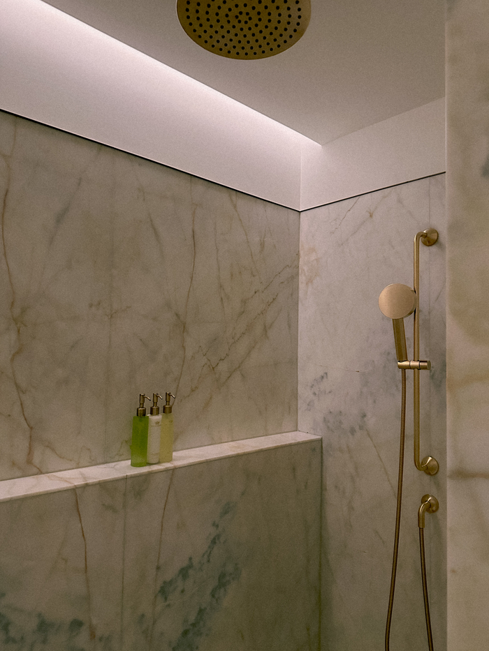 욕실 내부 / 사진=권효정 기자 넓은 욕실은 그 자체로 럭셔리의 정수를 보여준다. 흑백 대리석 타일이 그려내는 모노톤 바닥은 존재감을 뽐내고 깊이 있는 욕조는 사색에 잠기기 좋은 은신처가 된다.