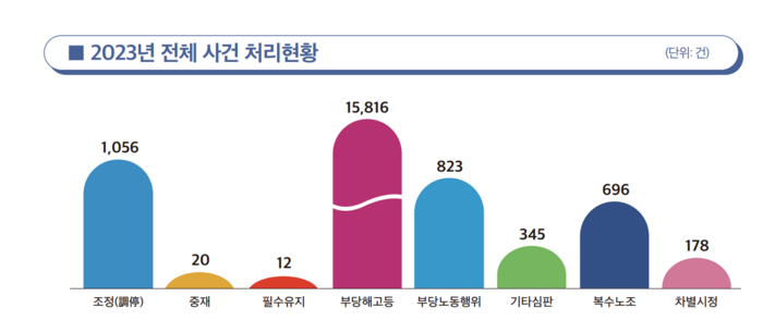 2023년 노동위원회 사건 처리 현황 [자료=중앙노동위원회] 지난해 노동위원회에서 다룬 ‘부당해고 등’ 구제신청 사건이 전년보다 20% 늘어난 것으로 나타났다.