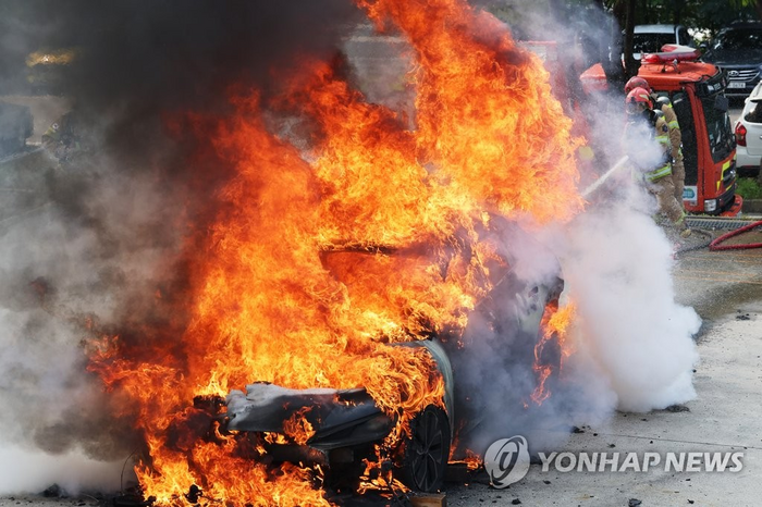 쉽게 꺼지지 않는 전기자동차 화재. [사진 출처 = 연합뉴스] 정부가 전기차 안전 강화를 위해 배터리 정보 공개를 의무화하고 배터리인증제를 다음달부터 조기 시행하기로 했다. 전기차 제조사를 대상으로 책임보험 의무 가입도 추진한다.