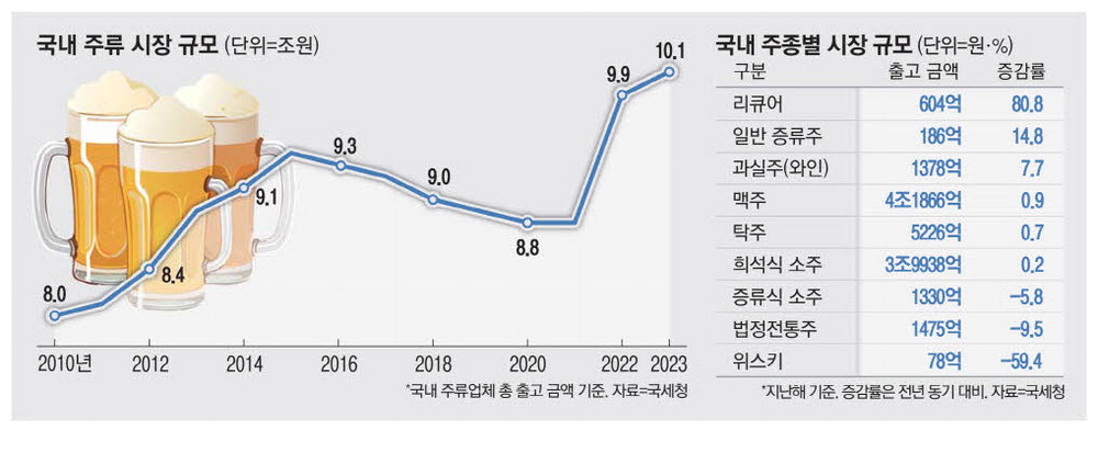 13일 매일경제가 국세청 주세 데이터를 분석한 결과 국내 술 시장 규모를 가늠하는 주류업체 출고 금액은 지난해 10조700억원으로 전년 동기 대비 1% 늘어 관련 통계가 집계된 2005년 이후 역대 최대로 불어났다.