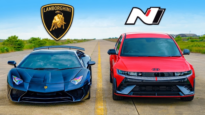 구독자 956만명을 보유한 영국 자동차 전문 유튜브 채널 ‘카와우’에 게재된 현대자동차 아이오닉5N과 람보르기니 아벤타도르 SV 드래그레이싱 영상 표지사진. [유튜브 캡처] 현대자동차의 첫 고성능 전기차 아이오닉5N이 해외 자동차 애호가들 사이에서 퍼포먼스카의 주행 성능을 가늠하는 잣대로 활용되고 있다. 출시 1주년을 맞은 아이오닉5N은 내로라하는 내연기관 고성능 모델들과 단거리 경주를 펼치며 고성능차로서 존재감을 각인시키고 있다.