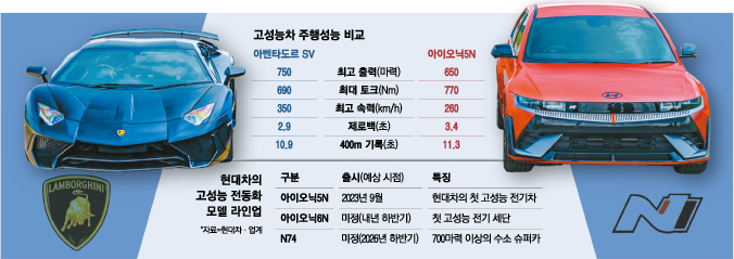 전동화를 발판으로 고성능차 시장에서 현대차의 위상은 앞으로 더 강화될 전망이다. 현대차는 지난 2022년 하반기에 아이오닉6 기반 고성능 콘셉트카 ‘RN22e’와 고성능 수소전기 하이브리드 콘셉트카 ‘N비전74’를 공개했다. 현대차는 두 콘셉트카를 양산형 모델로 내놓기 위한 준비 작업을 진행 중인 것으로 알려졌다. 이르면 아이오닉6N은 내년 하반기,수소 기반 고성능차는 2026년 하반기에 출시될 것으로 보인다.