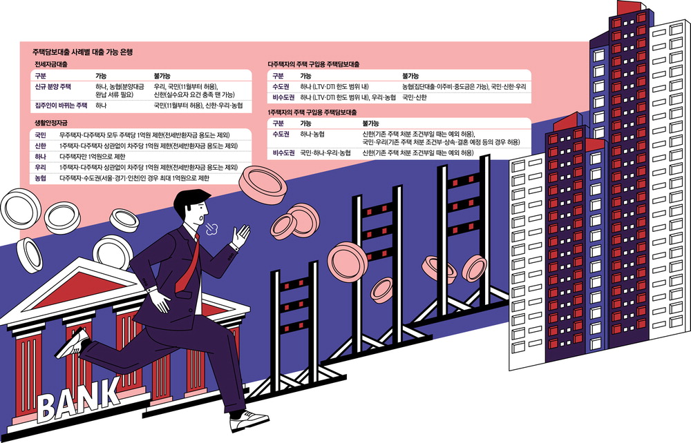 먼저 1주택자의 경우부터 따져 보자. 1주택자가 2주택자가 되기 위해 서울·경기·인천 등 수도권 지역 주택을 사는 경우 하나·농협 2곳 은행에서만 대출이 가능하고,국민·신한·우리 등 은행에서는 주담대를 받을 수 없다. 반면 비수도권 지역 주택을 추가 구입하려는 경우에는 신한을 제외한 나머지 은행에서 모두 주담대가 가능하다.