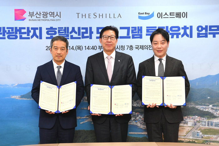 부산시는 14일 시청에서 호텔신라,이스트베이와 기장 오시리아관광단지에 5성급 호텔브랜드 신라 모노그램 건립을 위한 업무협약(MOU)을 체결했다. 협약식에는 박형준 부산시장을 비롯해 이정호 호텔신라 부사장,송창석 이스트베이 대표가 참석했다.