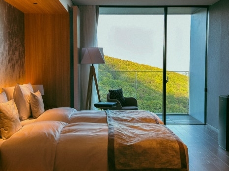 요테이산 전망의 객실 내부 / 사진=권효정 여행+ 기자 리조트 디자인은 일본에 본사를 둔 세계적인 건축회사 ‘니켄 세케이(Nikken Sekkei)’가 맡았다. 니켄 케세이는 아시아 최상위 건축설계기업이자 아시아에서 세 손가락 안에 드는 건축설계사로 평가받는다.무와 니세코는 전통과 현대의 조화를 통해 리조트 자체가 하나의 예술작품처럼 설계했다. 공간은 요테이산과 니세코 사계절을 그대로 느낄 수 있게 구성했다.