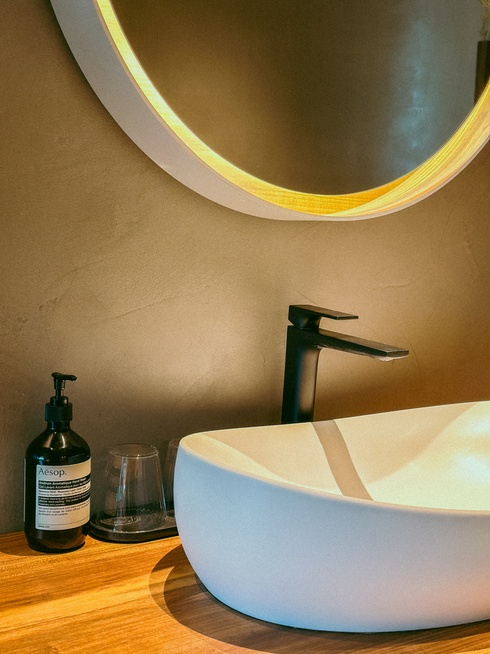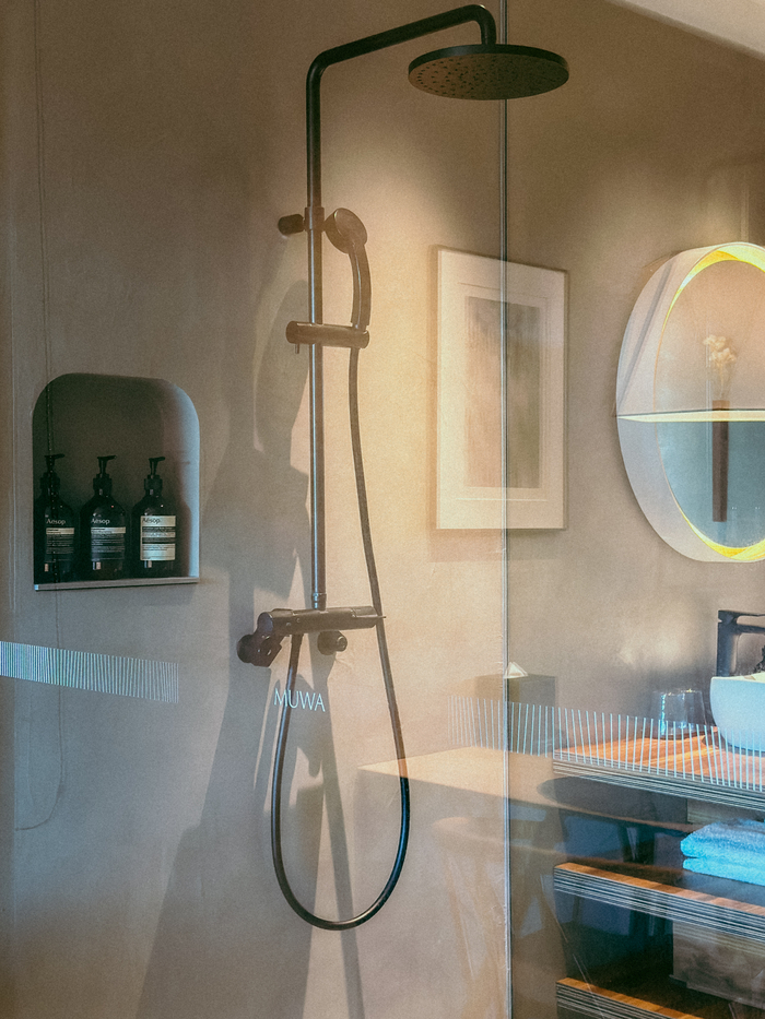 욕실 내부 / 사진=권효정 여행+ 기자 객실은 교토 마치야 방식을 차용해 긴 형태로 설계했다. 모든 객실에 세탁과 건조 기능이 함께 있는 일체형 세탁건조기를 갖췄다.