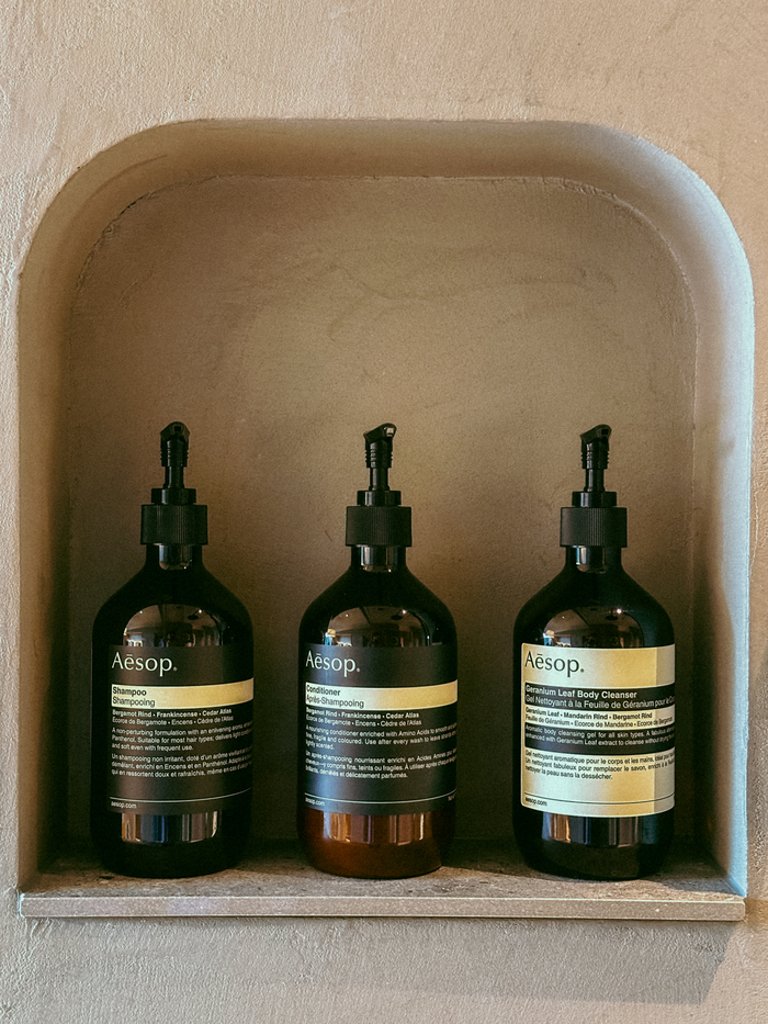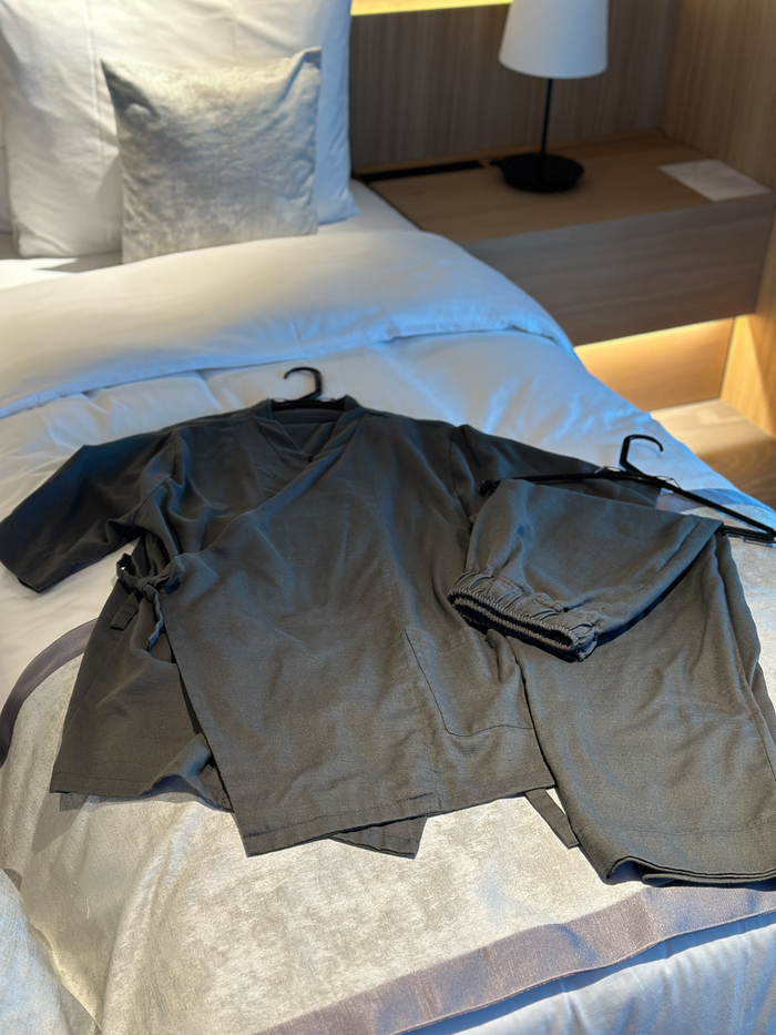 일본 전통 의복 사무에에서 영감을 받은 라운지웨어 / 사진=권효정 여행+ 기자 객실에는 일본 전통 의복 사무에(Samue)에서 영감을 받은 라운지웨어가 놓여있다. 서울 기반 텍스타일 디자이너 오유경과 협업해 자유로운 움직임을 강조했다. 어메니티는 자연주의 스킨케어 브랜드 ‘이솝’이다.스키어를 위한 원스톱 솔루션
