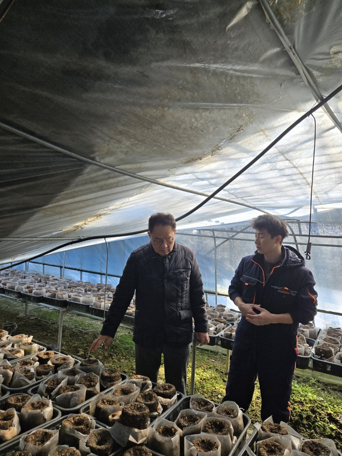[사진 = 농협중앙회] 지준섭 농협중앙회 부회장(사진 왼쪽)은 29일 폭설(습설)로 인해 시설하우스 등 농업시설에 피해가 발생,경기도 용인시 피해현장을 방문해 농업인을 위로했다.