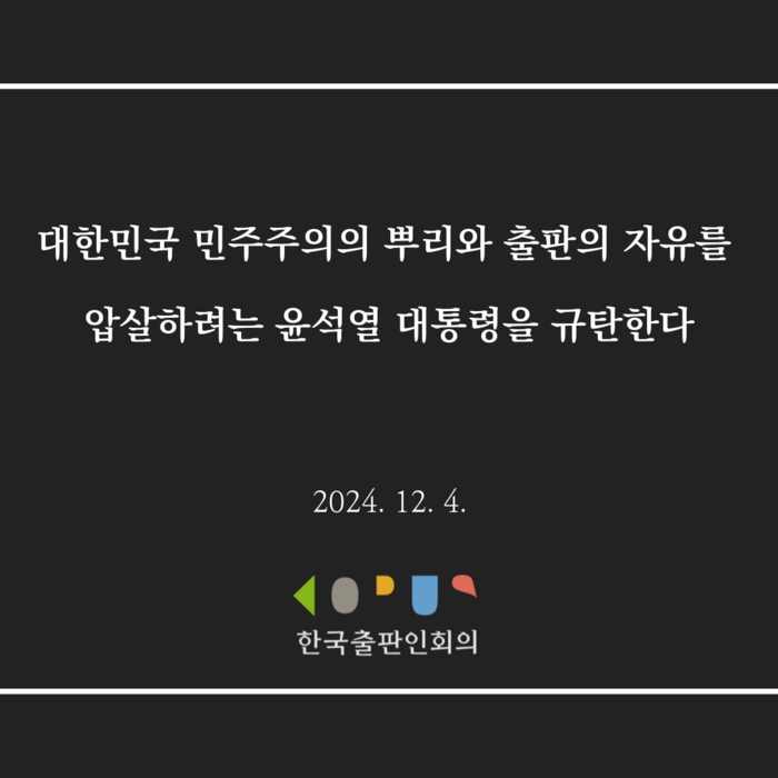출판인회의 성명 단행본 출판사들의 모임인 한국출판인회의는 4일 성명을 통해 “윤석열 대통령의 비상계엄령 선포에 따른 계엄사령부 포고령에 따라 출판의 자유마저 일시적으로 제한되었고,표현의 자유는 억압당했다”며 “불과 6시간 만에 출판의 자유를 제하려는 시도는 좌절되었지만,우리는 결코 지난밤의 악몽 같은 시간을 잊을 수 없다”고 밝혔다.