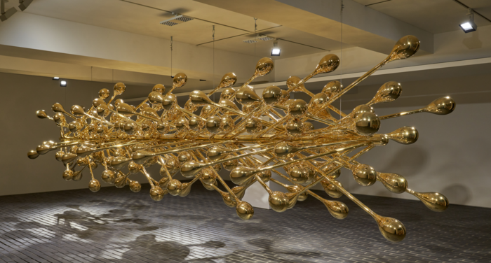 이번 전시의 대표작 ‘수평 정원’이 바로 그렇다. 가로 7m에 달하는 직선의 황금빛 청동을 가운데 두고,수십수백 개 가지 끝에 타원의 구(球)가 각각 달려 있다.