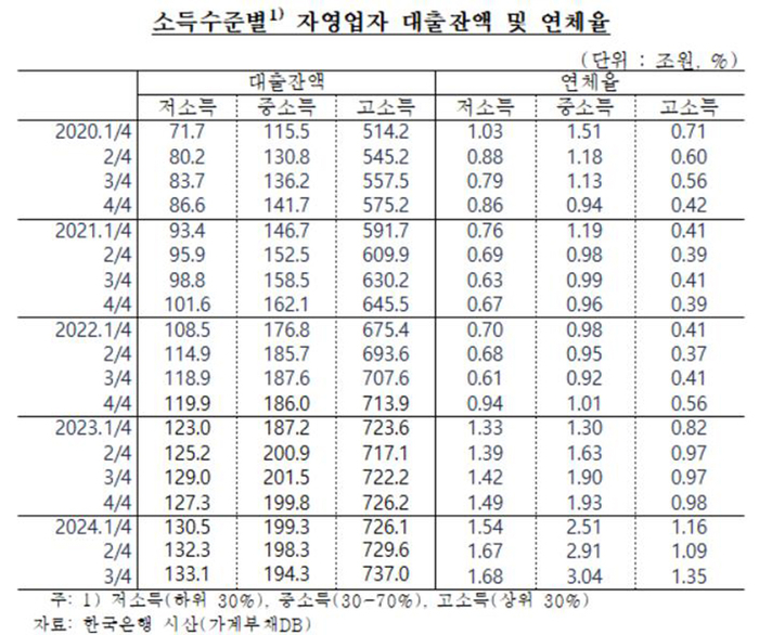 경기 둔화로 저소득은 물론 중소득·고소득 자영업자도 연체율이 치솟고 있는 상황이다.