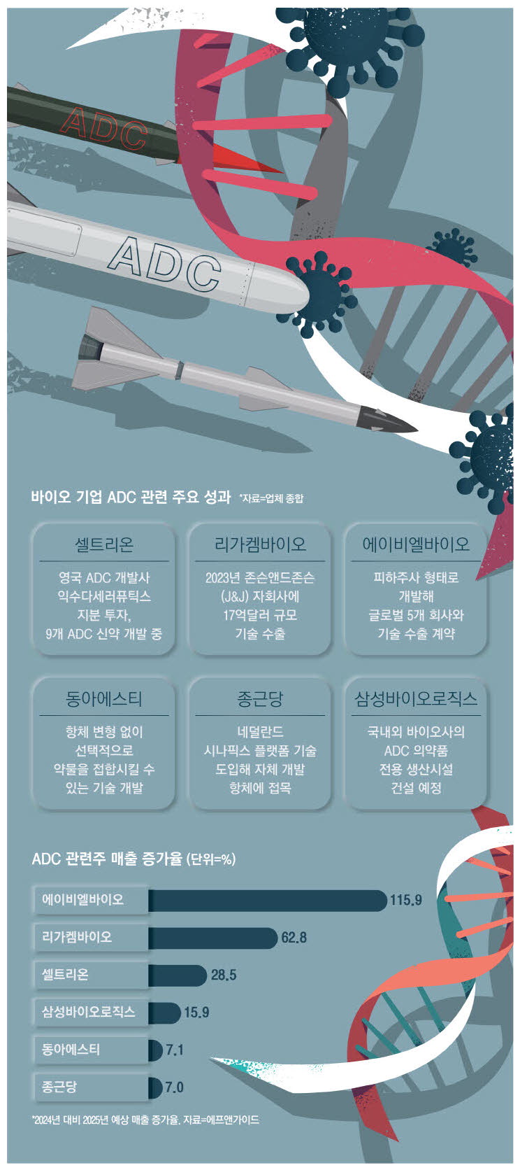 표적 약제인 항체와 암세포를 사멸시키는 약물을 링커로 결합해 유도미사일처럼 암세포를 선택적으로 죽이는 치료제다. 2019년 영국 바이오사 아스트라제네카와 일본 다이이찌산쿄가 공동 개발한 ADC 제품의 효능이 입증되면서 관련 시장이 형성됐다.