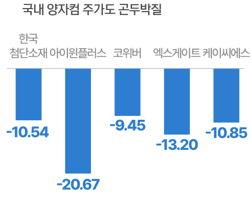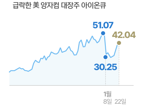 *단위: 달러 이 발언이 알려진 뒤 양자컴퓨터 관련 미국 기업들의 주가는 폭락했어요. 양자컴퓨터 기업인 ‘아이온큐’는 하루 만에 39% 하락했고,지난해 10배가량 주가가 오르며 엄청난 주목을 받았던 리게티컴퓨팅도 45.41% 급락했어요. 디웨이브퀀텀(-36.13%),퀀텀컴퓨팅(-43.34%) 같은 다른 기업도 마찬가지였어요. 물론 관련이 있는 우리나라 기업들도 급락세를 면치 못했죠.