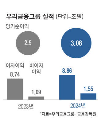 우리금융그룹이 지난해 연간 당기순이익으로 3조원 이상을 내며 '3조원 클럽'에 재진입했다. 지난 한 해 40%나 불어난 비이자이익이 실적 상승을 견인했다. 우리금융은 보험사 인수 작업 등 포트폴리오 다변화 작업에 속도를 내 수익성을 한층 끌어올리겠다는 목표다. 7일 우리금융그룹은 지난해 연간 당기순이익이 3조860억원을 기록했다고 밝혔다. 역대 기준으로는 2022년 3조3239억원 이후 두 번째로 높다. 전년 대비 당기순이익 증가율은 23.1%에 달했다. KB·신한·하나 등 다른 금융그룹들과 비교해도 좋은 성적표다.