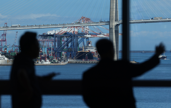 창문 밖으로 보이는 부산항 모습. [사진 = 연합뉴스] 한국이 산업 구조조정에 실패한다면 생산성 부진이 이어져 2050년 경제성장률이 0%대로 추락할 것이라는 경고가 나왔다.