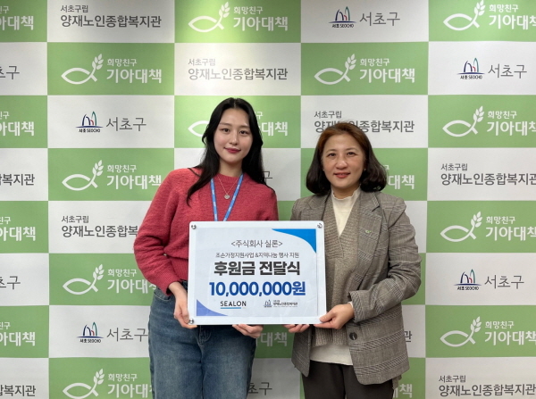 < 사진 제공 : 실론(SEALON) > 의류용 접착 필름 제조 전문 기업 실론(SEALON)은 지난 1월 23일 설 명절을 맞아 지역사회에 따뜻한 나눔을 실천하고자 서초구립 양재노인종합복지관에 1000만원의 기부금을 전달했다고 밝혔다.