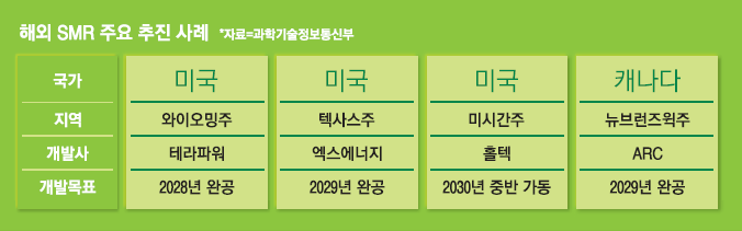 미국은 테라파워와 엑스에너지 등 대표 SMR 기업들이 와이오밍주 화력발전소 인근 용지에 345㎿(메가와트) 용량의 SMR을 건설 중이다. 멕시코만 화공단지에도 2029년 완공 목표로 4기의 SMR을 건설 중이다.