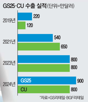 2일 유통업계에 따르면 국내 편의점 ‘투톱’인 GS25와 CU의 운영사인 GS리테일과 BGF리테일은 모두 올해 수출액이 1000만 달러에 육박할 전망이다.