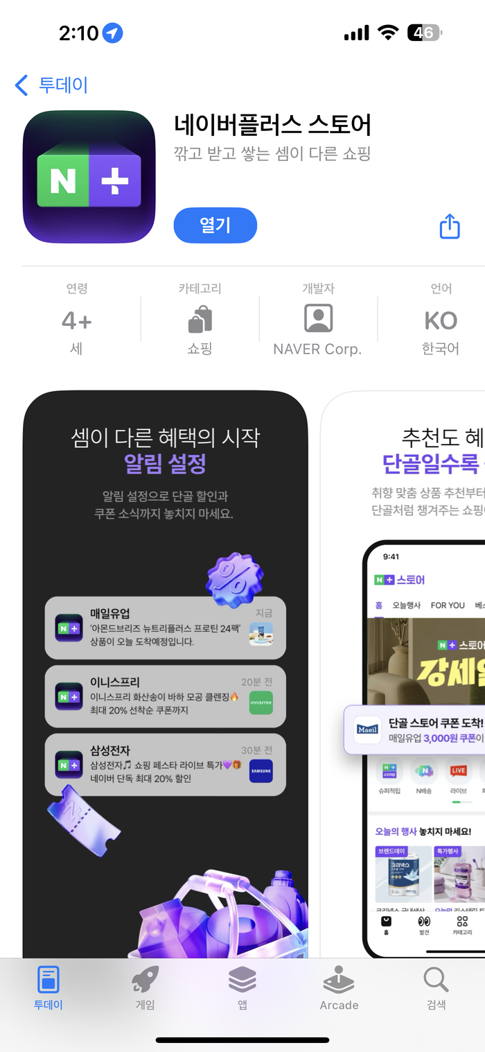 애플 스토어서 출시된 ‘네이버플러스 스토어’. [사진 출처 = 독자 제공] 네이버의 자체 인공지능(AI) 쇼핑앱 ‘네이버플러스 스토어’가 출시 직후부터 이용자들의 큰 주목을 받고 있는데 가운데,일주일째 넘게 지연됐던 아이폰 버전 출시가 19일 오전 이뤄졌다. 애플의 앱 심사가 마무리되면서 애플 스토어에서도 설치가 가능해진 것이다.