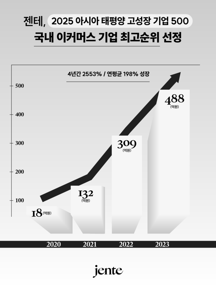 젠테는 심사 기간 내 매출 증가율 2553%,연평균 성장률 198%를 기록하며 전체 순위 20위를 기록했다. 2020년 창업 당시 18억원이었던 매출이 2023년 488억원으로 4년 만에 25.5배 성장한 결과다.