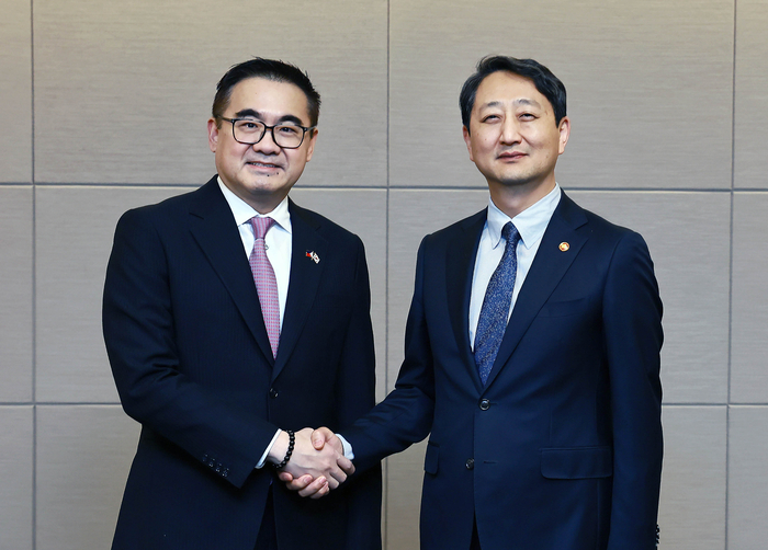 안덕근 산업통상자원부 장관(오른쪽)이 7일 서울 중구 대한상공회의소 국제회의장에서 프레더릭 고 필리핀 대통령실 투자경제특별보좌관과 만나 기념촬영을 하고 있다. <사진=산업통상자원부>