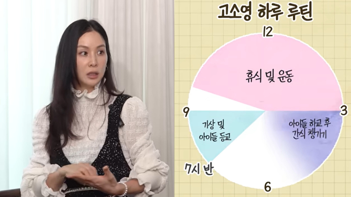 고소영의 하루는 아이들을 위주로 돌아갔다. 고소영은 “(하루 루틴이) 단순하다”면서 “아침 7시 30분쯤 일어나서 애들 학교 보내고 좀 쉬다가 운동 가거나 산책하고 애들이 3시쯤 오면 간식을 챙겨준다”고 설명했다.