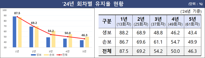 22일 금융감독원 ‘2024년 보험회사 판매채널 영업효율 및 감독방향’에 따르면 지난해 국내 보험계약 유지율은 1년차(13회 납입)에 87.5%,2년차(25회)에 69.2%,3년차에 54.2%로 떨어지는 것으로 나타났다. 주요국과 비교해 계약 유지율이 크게 낮다. 2년차 유지율은 싱가포르에서 96.5%,대만에서 90%,미국에서 89.4%다. 3년차 유지율은 50%대로 떨어지는데 이는 설계사에 대한 수수료 선지급 기간이 종료되기 때문으로 해석된다. 고객에게 잘해줄 유인이 크게 줄어든다는 것이다.