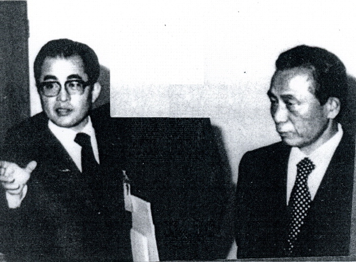 고 김재관 박사(왼쪽)가 한국과학기술연구원(KIST)을 방문한 박정희 대통령에게 중공업 육성 방안을 설명하고 있다.