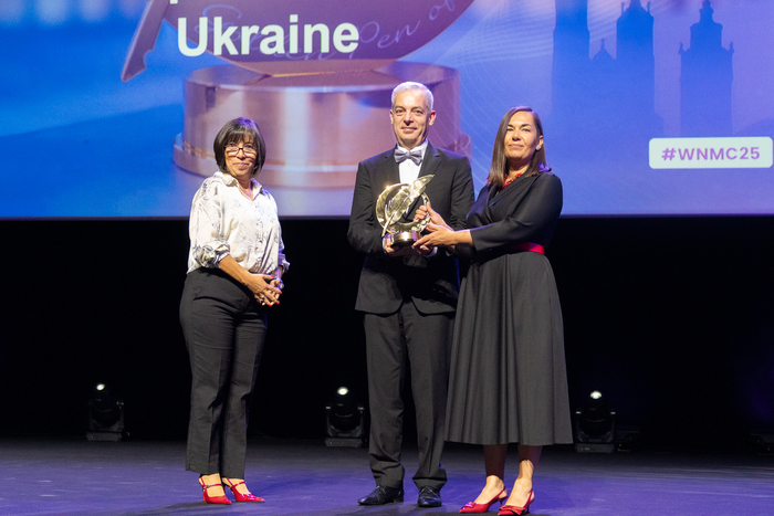 4일(현지시간) 폴란드 크라쿠프 ICE 콩그레스 센터에서 제76회 세계뉴스미디어총회 ‘자유의 황금펜 상’ 시상식이 열렸다. 왼쪽부터 마사 라모스 세계편집자포럼 회장,올렉시 포고레로프 우크라이나 미디어비즈니스협회(UMBA) 회장,옥사나 브로브코 우크라이나 독립지역언론협회(AIRPPU) 회장. 사진제공=세계신문협회