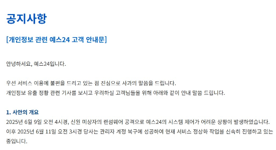 예스24는 ‘고객 피해 최소화를 위한 안내 사항’도 올렸다. 예스24는 당사 또는 금융기관을 사칭한 문자·이메일·전화를 주의하라고 당부했다. 또 출처가 불분명한 링크나 첨부파일은 열지 말고 바로 삭제하라고 했다. 아울러 본인 명의 계좌·카드 발급 내역도 확인하라고 공지했다.