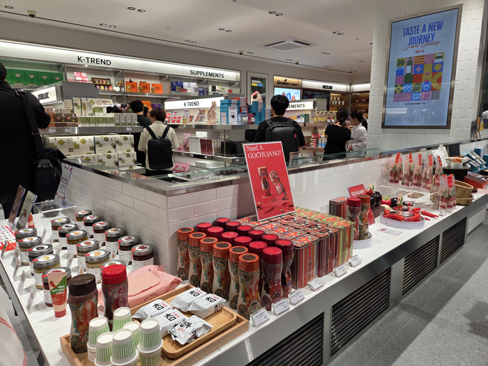 신세계면세점 명동점 11층 테이스트 오브 신세계에 진열된 케이첩의 고추장과 쎄콩데 스프레드 [김헤진 기자] 테이스트 오브 신세계에서도 가장 먼서 시선을 끈 곳은 신세계 푸드마켓 존이었다. 국내외를 가리지 않고 인기가 많은 불닭볶음면과 허니버터아몬드,비비고 간편식,삼청동 명물 간식 등이 다채롭게 진열돼 있었다. 매운맛을 찾는 외국인을 위한 케이첩의 고추장과 쎄콩데 스프레드도 눈길을 사로잡았다.