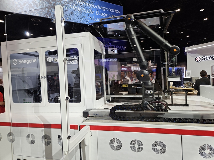 진단검사의학 분야 세계 최대 학회 ‘ADLM 2025’가 열리고 있는 미국 시카고. 전시장 중앙에 위치한 씨젠 부스에서는 거대한 로봇팔이 소변,대변,객담 같은 고점도 검체를 자동으로 채취해 보존액이 담긴 튜브에 넣고 고르게 섞은 뒤,원심분리까지 진행하는 모습이 시연됐다.