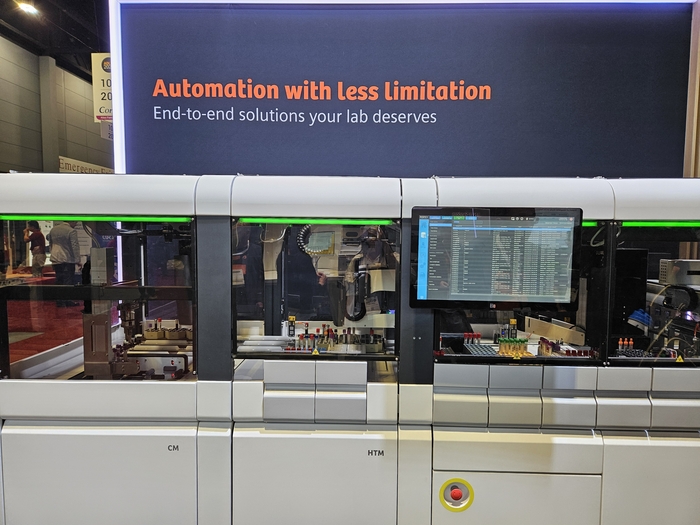 부스 한쪽에 설치된 cobas p471/p612 연결 모듈은 로슈의 검사실 자동화 기술을 보여주는 대표 장비였다. 시료 분류와 준비,검사기기로의 전달까지 수행하지만,전 과정 무인화보다는 정밀한 워크플로우 통합과 분석 신뢰도를 강조하는 방식이었다.