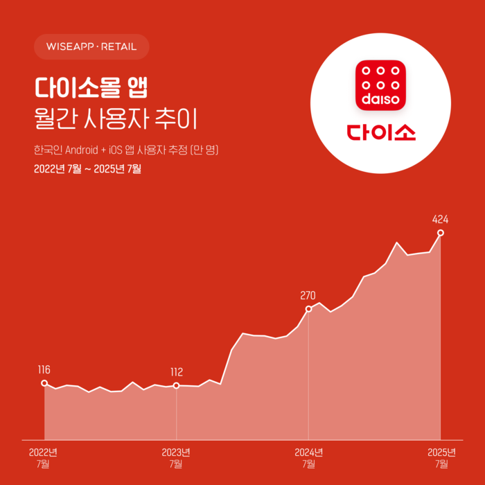 실시간 앱·결제 데이터 기반 시장 분석 솔루션 와이즈앱·리테일은 다이소몰 앱의 월간 활성 사용자 수(MAU)와 성연령대별 사용자 비율을 조사해 7일 발표했다. 한국인 스마트폰 사용자를 표본 조사한 결과,지난달 다이소몰 앱의 MAU는 424만명을 기록하며 전년 동월 270만명 대비 57% 증가해 역대 최대치를 경신했다.
