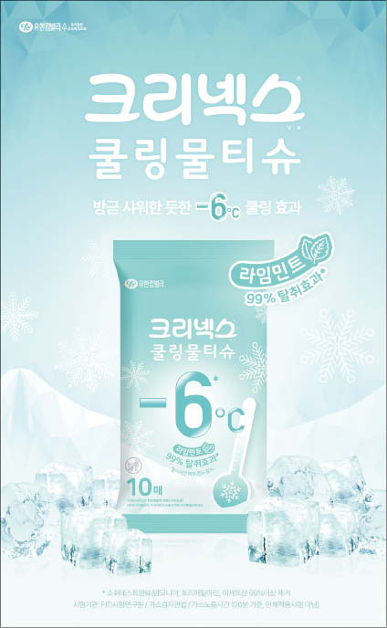 크리넥스 쿨링물티슈는 일시적으로 6도가량 피부 온도를 낮춰주는 쿨링 효과가 보고된 제품으로 지난해 처음 출시됐다. 유한킴벌리 관계자는 “덥고 열감 있는 피부를 닦아내는 데 유용할 뿐 아니라 몸을 닦기에도 넉넉한 크기 덕분에 운동,작업,여행 등 어떤 상황에서도 편리하게 사용할 수 있다”고 설명했다.