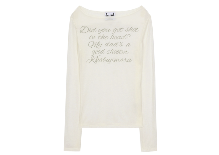 블랙핑크 제니가 입은 ‘길라 아카이브’의 레터링 시어 롱 슬리브 티가 화제가 되고 있다. [사진 = W컨셉 홈페이지 캡처] 티셔츠에 적힌 레터링 문구도 화제가 됐다. ‘Did you get shot in the head? My dad is a good shooter. Kkabujimara’(머리에 총 맞았냐. 우리 아빠 사격 잘해. 까불지 마라)는 문구가 적혀 있는데. 특히 ‘까불지마라’를 한국어 발음을 그대로 알파벳으로 표기해 웃음을 자아냈다.