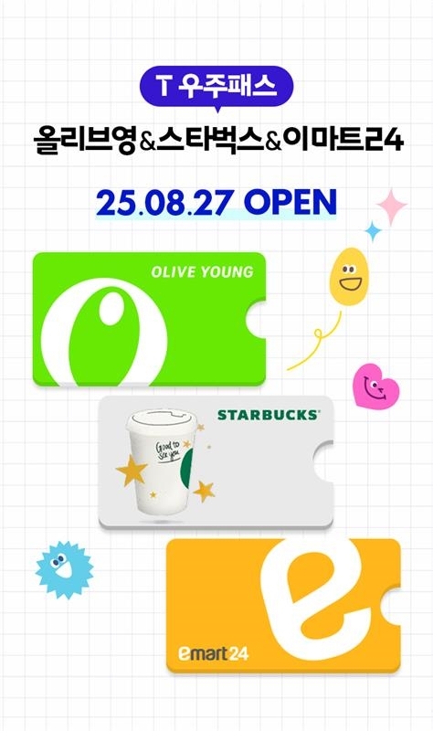 ‘T 우주패스 올리브영&스타벅스&이마트24’. [사진 = SKT 제공] 스타벅스코리아는 SKT의 구독 서비스 ‘T 우주’와 제휴를 통해 제조 음료를 20% 할인해 주는 구독 상품을 오는 27일 선보인다고 21일 밝혔다.