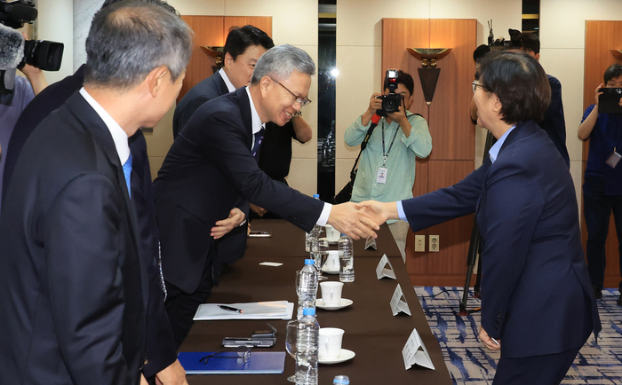 정은경 보건복지부 장관이 3일 서울 코리아나호텔에서 열린 6개 보건의학단체장 간담회에서 김택우 대한의사협회 회장과 인사하고 있다. [사진=연합뉴스] 보건복지부 장관이 주요 보건의약단체장들을 만나 지난 1년 반 동안 의료 현장을 지켜준 데 대해 감사를 표했다. 전공의 복귀와 함께 의료 대란이 마무리 수순에 돌입해,의료계와 정부도 새로운 관계를 찾아나설 것으로 보인다.