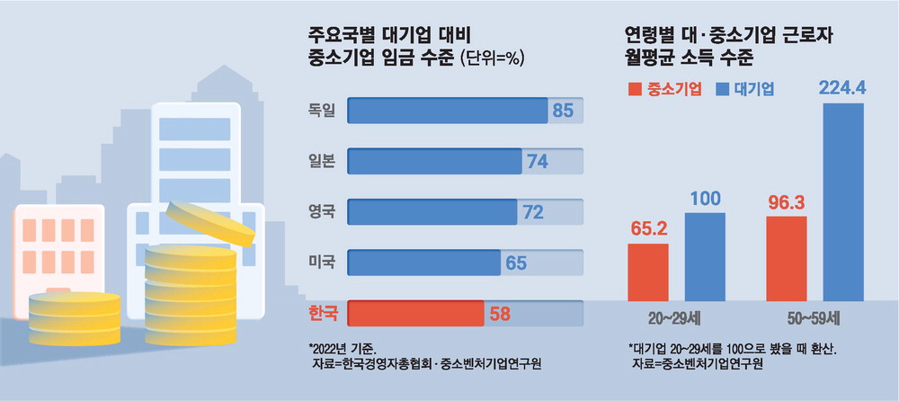 대·중소기업 간 임금 격차는 국제적으로 비교해도 한국이 크다. 한국경영자총협회가 지난 2월 발표한 '한·일·유럽연합(EU) 기업 규모별 임금 수준 국제 비교'에 따르면 2022년 기준 대기업 임금 수준이 100이라고 했을 때 중소기업 임금 수준이 한국은 58에 불과한 반면,EU는 65,일본은 74였다. 특히 일본은 대기업 대비 중소기업 임금 수준이 2002년 64였지만 인력 유출 방지를 위해 꾸준히 중기 임금을 올리면서 74까지 올라갔다. 반면 한국은 2002년 70에서 2022년 58로 급락했다.