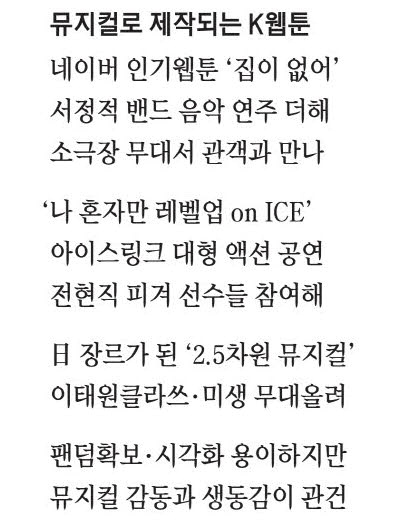 웹툰을 더 다양한 방식으로 향유하려는 팬들의 열정과 새로운 관객층을 무대로 끌어들이려는 제작사의 요구가 맞물리며,웹툰의 무대화는 공연계의 새로운 흐름으로 부상하고 있다. 일본이 '나루토' '데스노트' 등 애니메이션 기반의 '2.5차원 뮤지컬'을 신장르로 확립하며 공연 시장을 확장한 것처럼,한국에서도 'K웹툰 뮤지컬'이 하나의 장르로 자리 잡을 수 있을지 관심이 쏠린다.