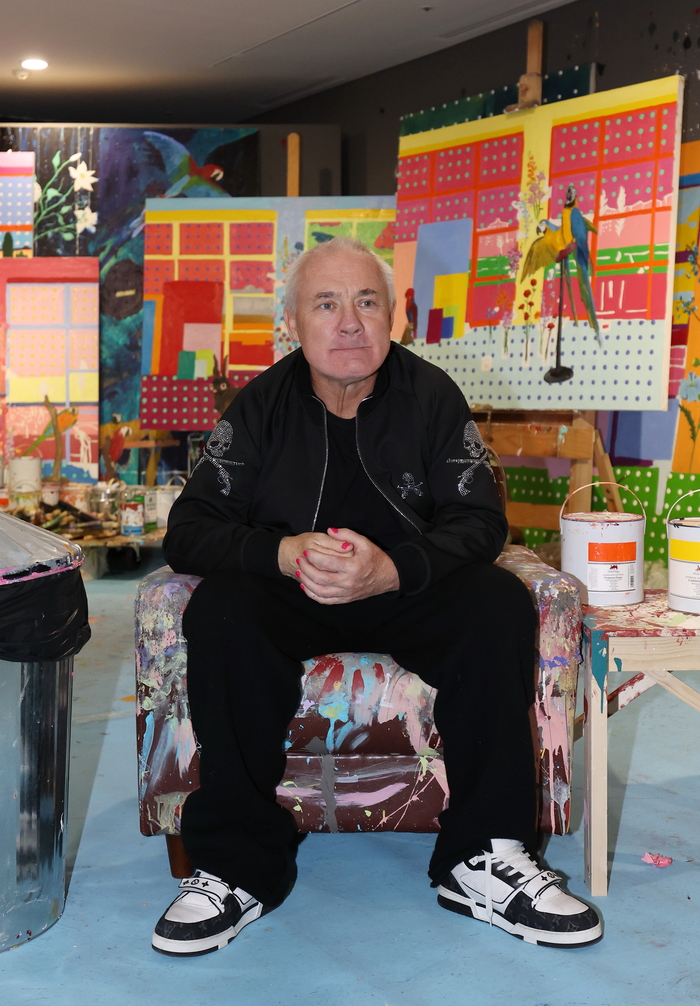 영국 작가 데이미언 허스트가 18일 서울 종로구 국립현대미술관에서 열린 ‘진실은 없어 그러나 모든 것은 가능하지’ 개인전에 전시된 작가의 스튜디오에서 포즈를 취하고 있다. <연합뉴스>