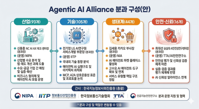 기술 분과는 전기정 LG AI연구원 서비스개발 부문장이 맡아 에이전틱 AI 간 상호운용성을 위한 표준과 아키텍처 최적화를 논의한다. 기술 분과 운영은 정보통신기획평가원이 지원한다. 생태계 분과는 김세웅 카카오 AI커뮤니케이션·AI시너지 부사장이 분과장을 맡고 한국지능정보사회진흥원이 운영을 지원한다. 여기선 수요가 높은 다양한 AI 에이전트와 도구를 확보·연계하고,서비스 유형별 책임 구조를 정립할 예정이다.